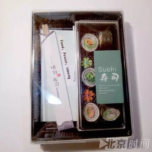 其中最為特別的是2016級(jí)編輯出版專業(yè)學(xué)生黃鋇的書(shū)冊(cè)設(shè)計(jì)。她將其中講述日本飲食文化的書(shū)頁(yè),卷成壽司模樣,與日餐筷子、裝飾小花整整齊齊擺在黑色塑料盒中。黃彥老師給這個(gè)設(shè)計(jì)點(diǎn)贊,“這個(gè)會(huì)獲大獎(jiǎng)哦!”